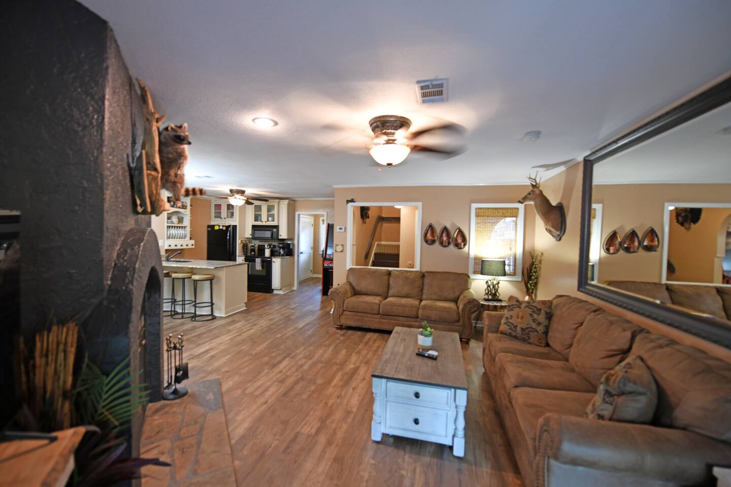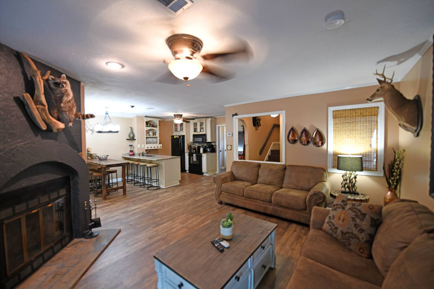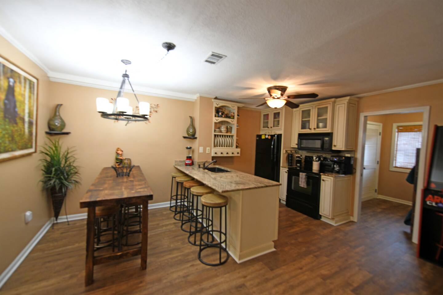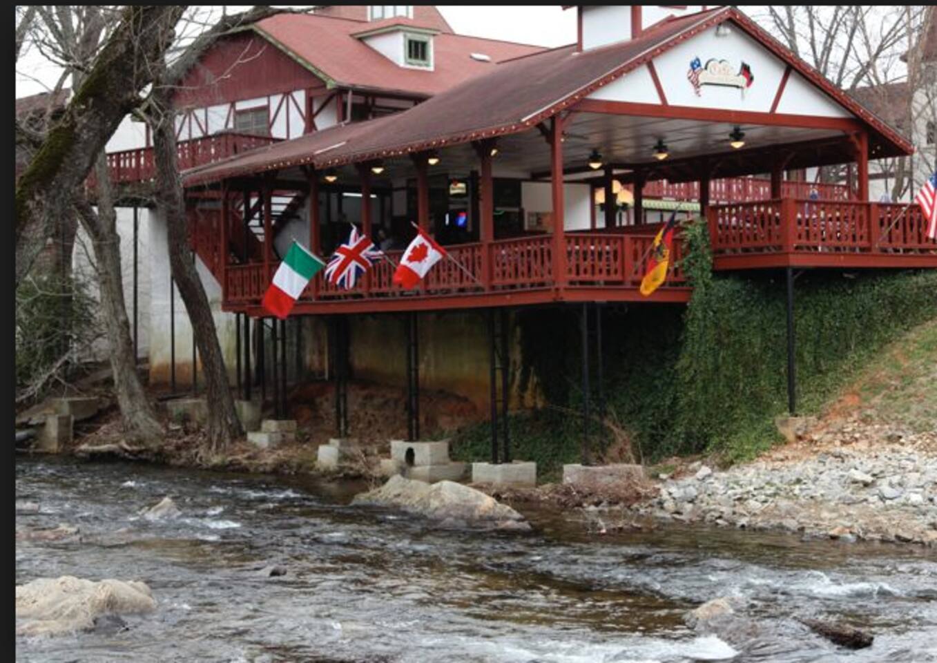 Enjoy Riverfront Luxury accommodations downtown Beautiful Helen Georgia. Walk to town, fish, swim and enjoy Helen at its best! Our newly renovated retreat features 3 comfortable bedrooms with two king master suites and one bunk bed bedroom. Flat panel TVs throughout, not that you will watch much TV with the abundance of great attractions nearby. Enjoy rafting, zip lines, kayaking, tubing, water parks, horseback riding, golf, canoeing, fishing, wildlife refuge or hiking many waterfalls close by.