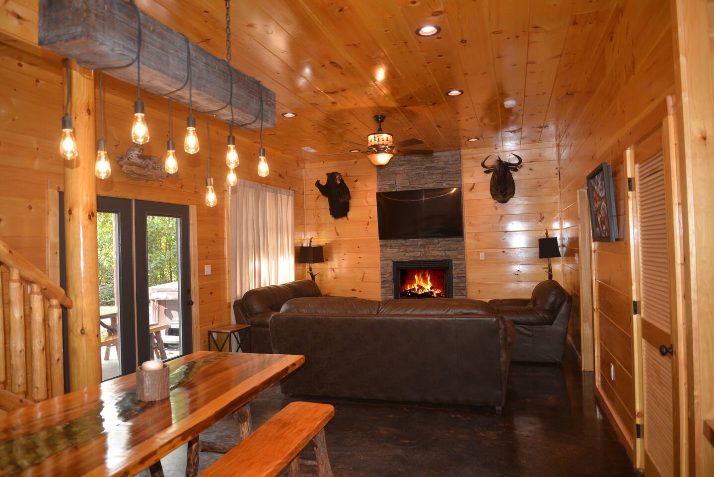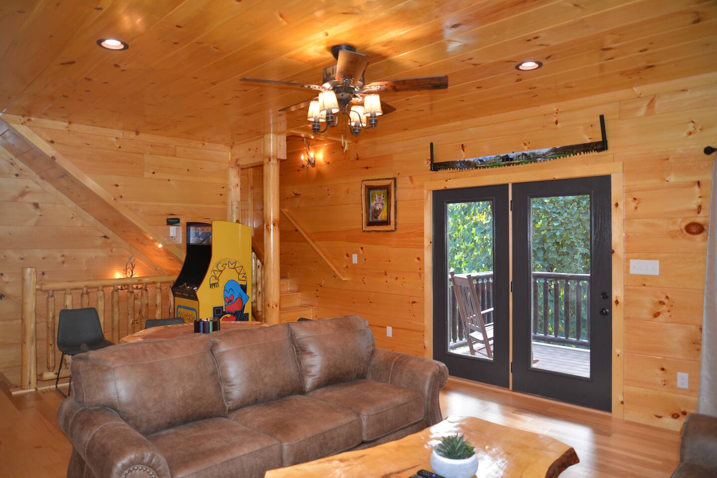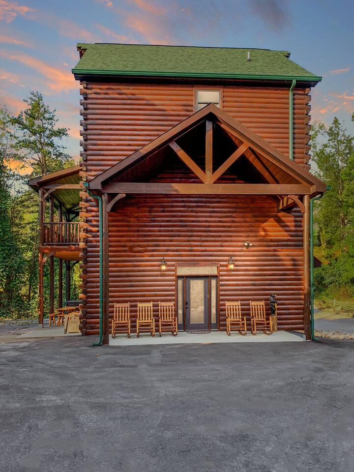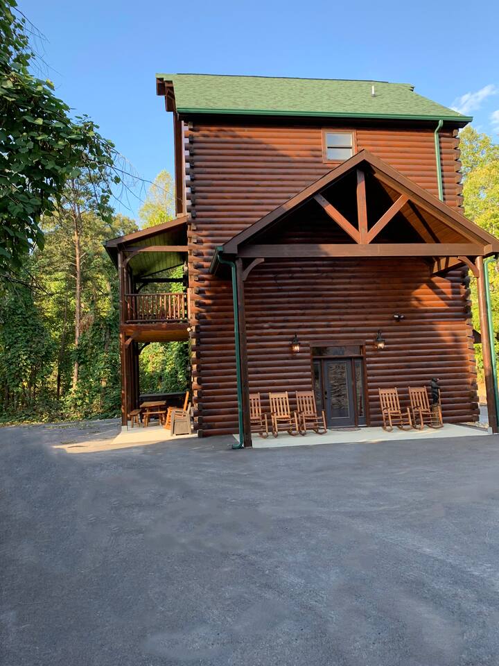Luxury Log Home Convenient to Downtown! 5 King Master Suites with full baths, Downtown Convenience, Views, Upscale & Fully Outfitted for your vacation pleasure. Stacked Stone gas log fireplace in great room, 60 games on multi-arcade in game room, card/ poker table, 8 smart tv's, charcoal grill & so much more. Large Jacuzzi on spacious deck. No Steps, Easy Cabin Entry on Level Lot. Neighborhood bears spotted frequently in our yard! You will love our cabin as much as we do.