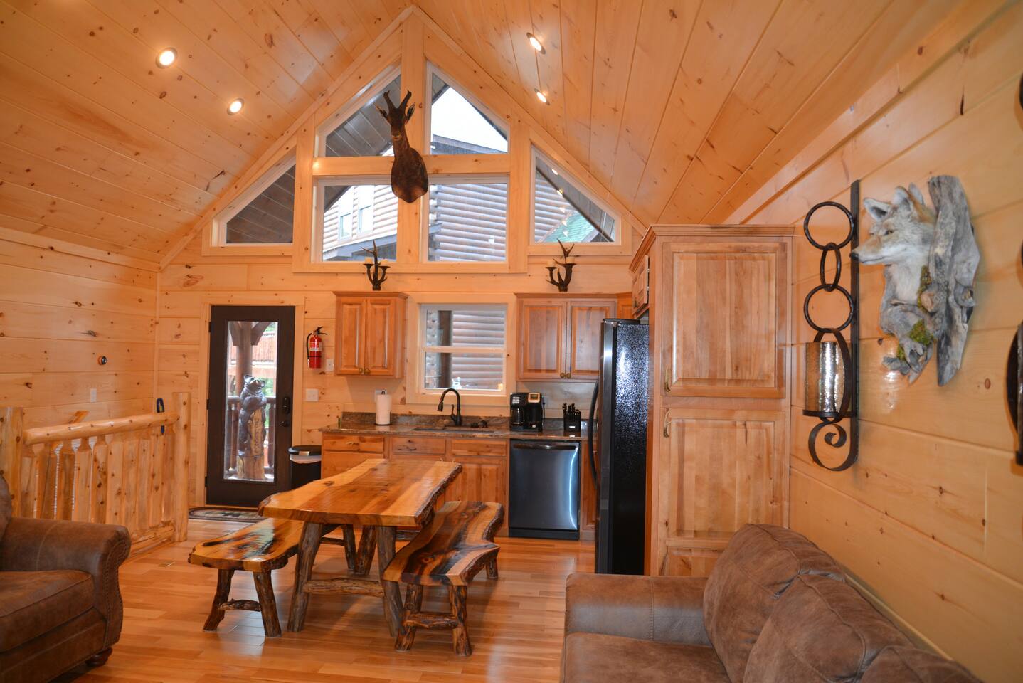 Just off the main strip awaits a luxury escape where every room provides a rustic yet luxurious retreat. This 4br, 4ba log home is an ideal getaway for a comfortable retreat. Each master suite features a king bed, luxury linens, log furniture and a private bath w/jacuzzi and walking shower. Two Living Rooms, Fireplace, gourmet kitchen with granite countertops, french doors open to 2 decks with rocking chairs and outdoor jacuzzi that are waiting for your enjoyment.