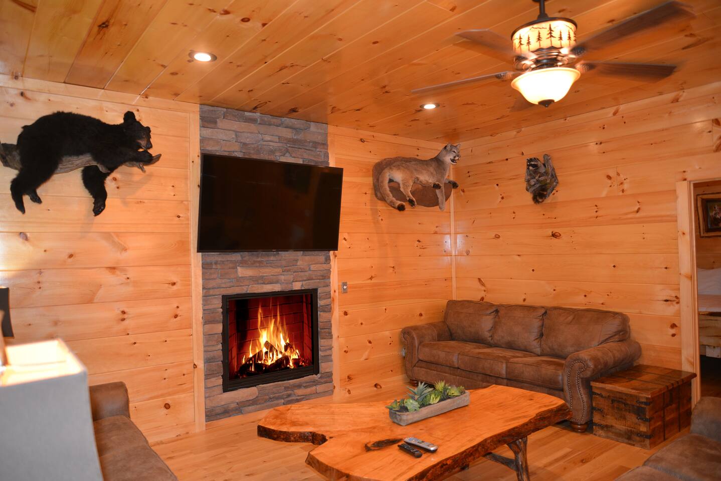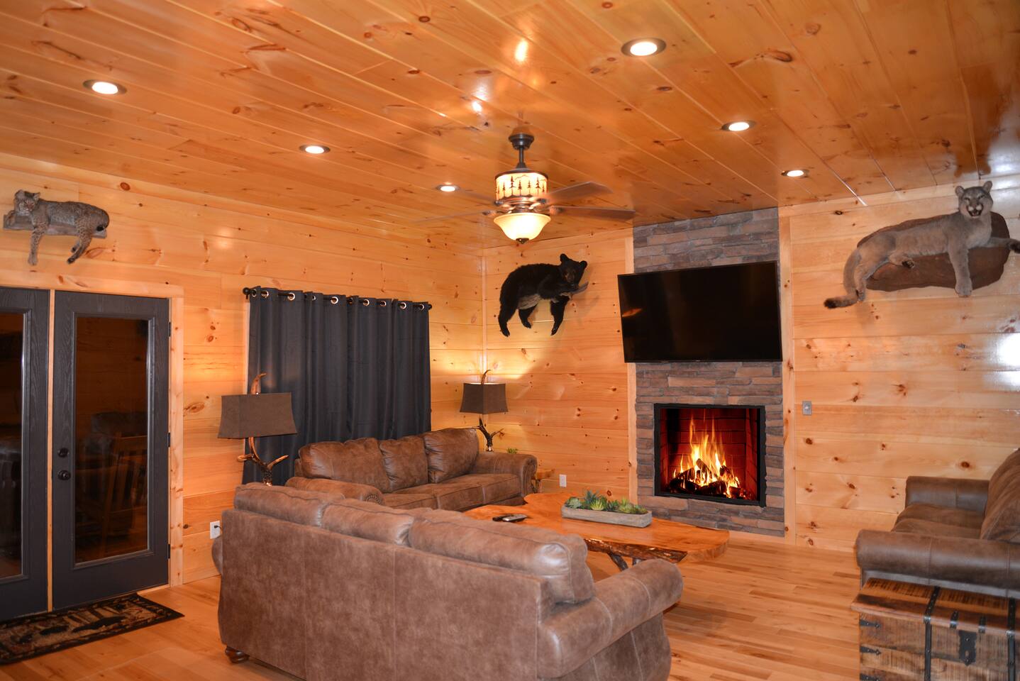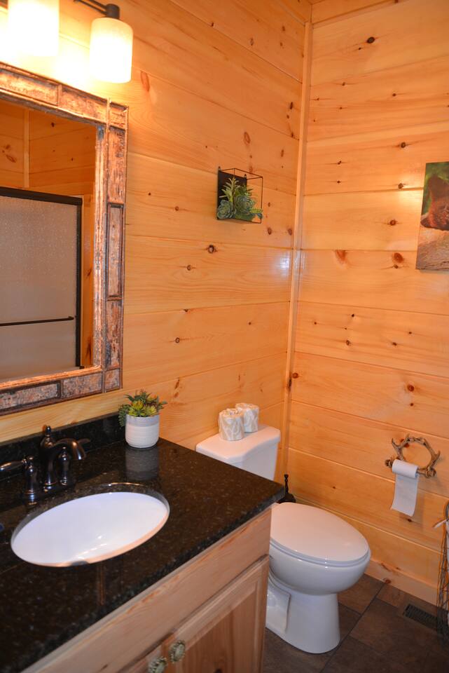 Luxury Log Home Convenient to Downtown! 5 King Master Suites with full baths, Downtown Convenience, Views, Upscale & Fully Outfitted for your vacation pleasure. Stacked Stone gas log fireplace in great room, 60 games on multi-arcade in game room, pool table, 8 smart tvs, charcoal grill & so much more. Large jacuzzi on spacious deck overlooking panoramic mountain views. Neighborhood Bears spotted frequently in our yard! You will love our cabin as much as we do.