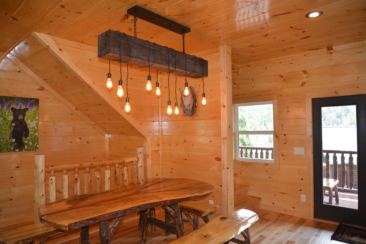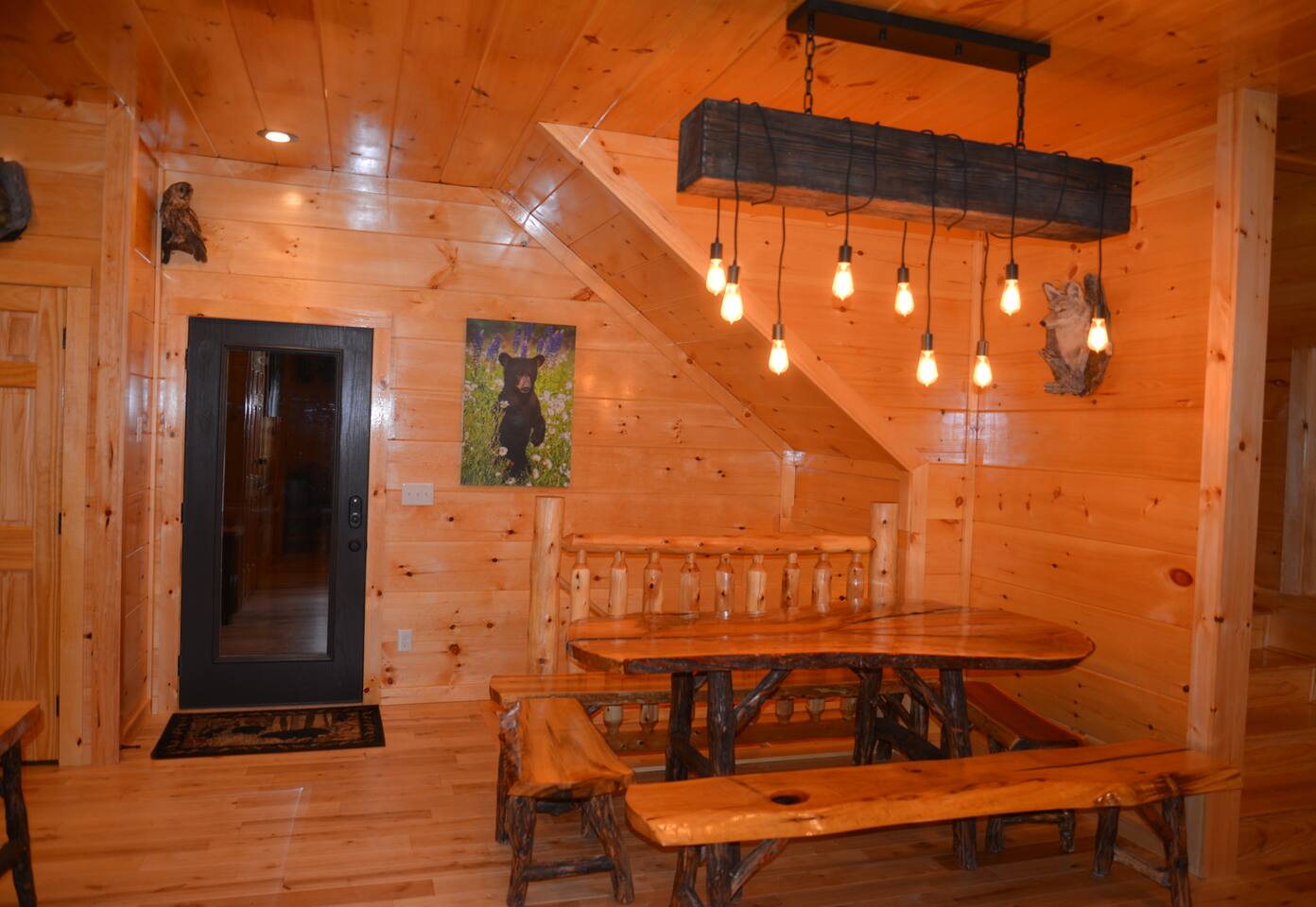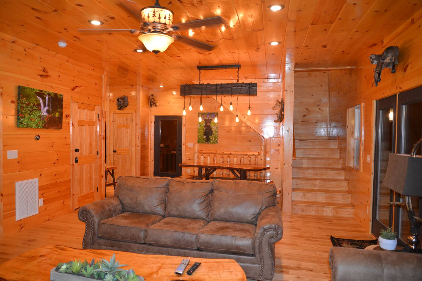 Luxury Log Home Convenient to Downtown! 5 King Master Suites with full baths, Downtown Convenience, Views, Upscale & Fully Outfitted for your vacation pleasure. Stacked Stone gas log fireplace in great room, 60 games on multi-arcade in game room, pool table, 8 smart tvs, charcoal grill & so much more. Large jacuzzi on spacious deck overlooking panoramic mountain views. Neighborhood Bears spotted frequently in our yard! You will love our cabin as much as we do.